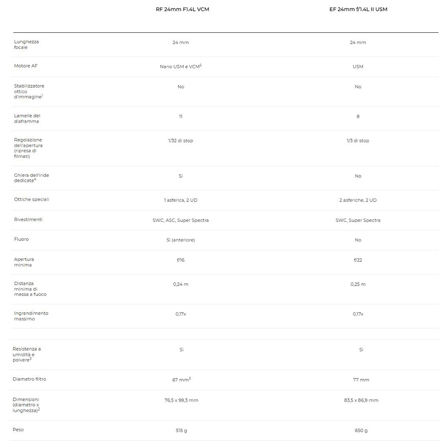 Di seguito una breve panoramica delle specifiche tecniche di Canon RF 24mm f/1.4L VCM visibili a colpo d’occhio.