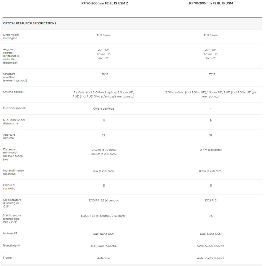 Differenze tra Canon RF 70-200mm f/2.8L IS USM Z e RF 70-200mm f/2.8L IS USM