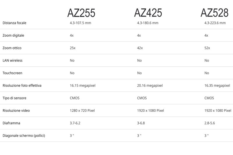 La serie AZ è perfetta per chi desidera funzioni più avanzate e uno zoom importante, senza però rinunciare alla portabilità. AZ255, AZ425, AZ528 sono le tre fotocamere bridge di questa serie che ci sentiamo di consigliarti.