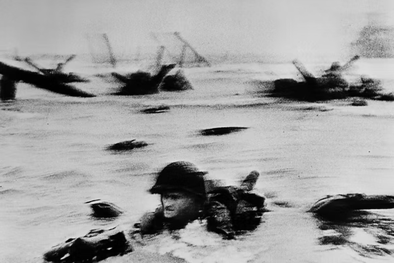 Imbarcato con i soldati americani sulla spiaggia di Omaha, Capa realizzò una serie di scatti tremolanti, sfocati, quasi astratti — immagini nate dal caos e dalla paura.