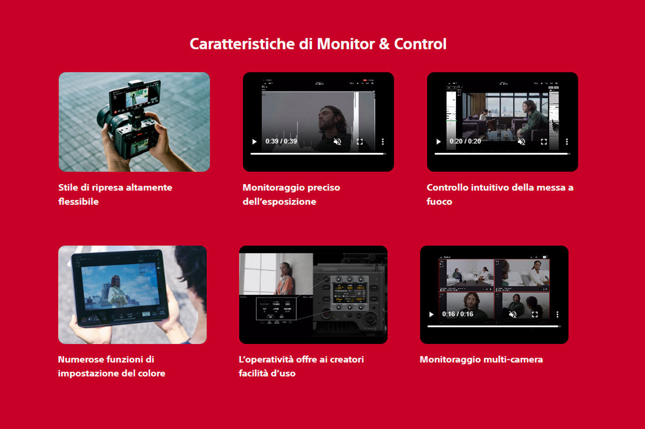 Monitor & Control trasforma il tuo smartphone/tablet/Mac in un secondo monitor per fotocamere Sony, con controllo remoto della messa a fuoco, strumenti professionali per l’esposizione (forma d’onda, falso colore, zebra, istogramma), gestione LUT e monitor multi-camera. L’app prevede un piano gratuito e piani a pagamento con funzioni ancor più avanzate.