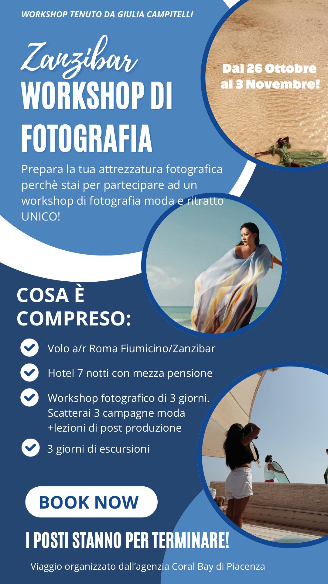 – Siamo sicuri sarà un’esperienza meravigliosa. Per questo motivo, ci va di condividere con chi ci legge tutte le info sul Workshop a Zanzibar con Giulia Campitelli). Ci sono ancora pochissimi posti disponibili, ma sarà un’occasione incredibile per arricchire il proprio portfolio!
